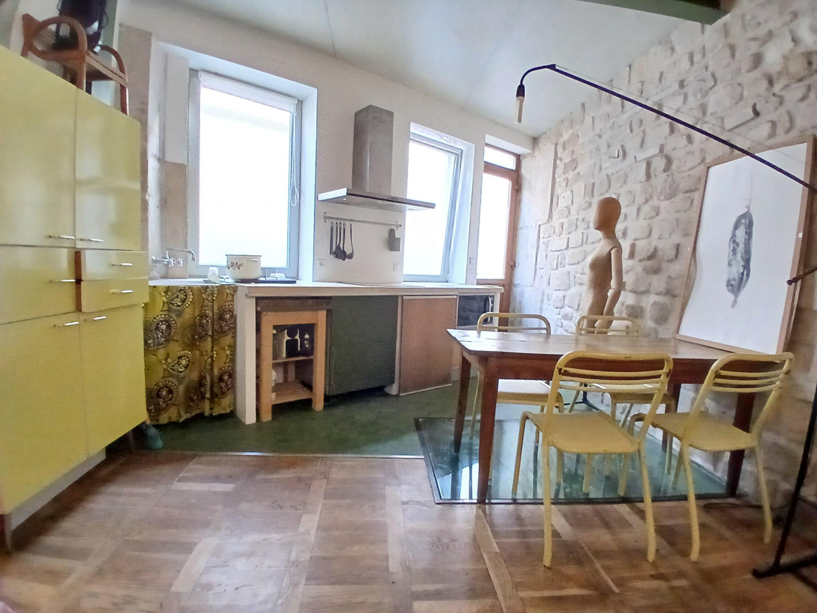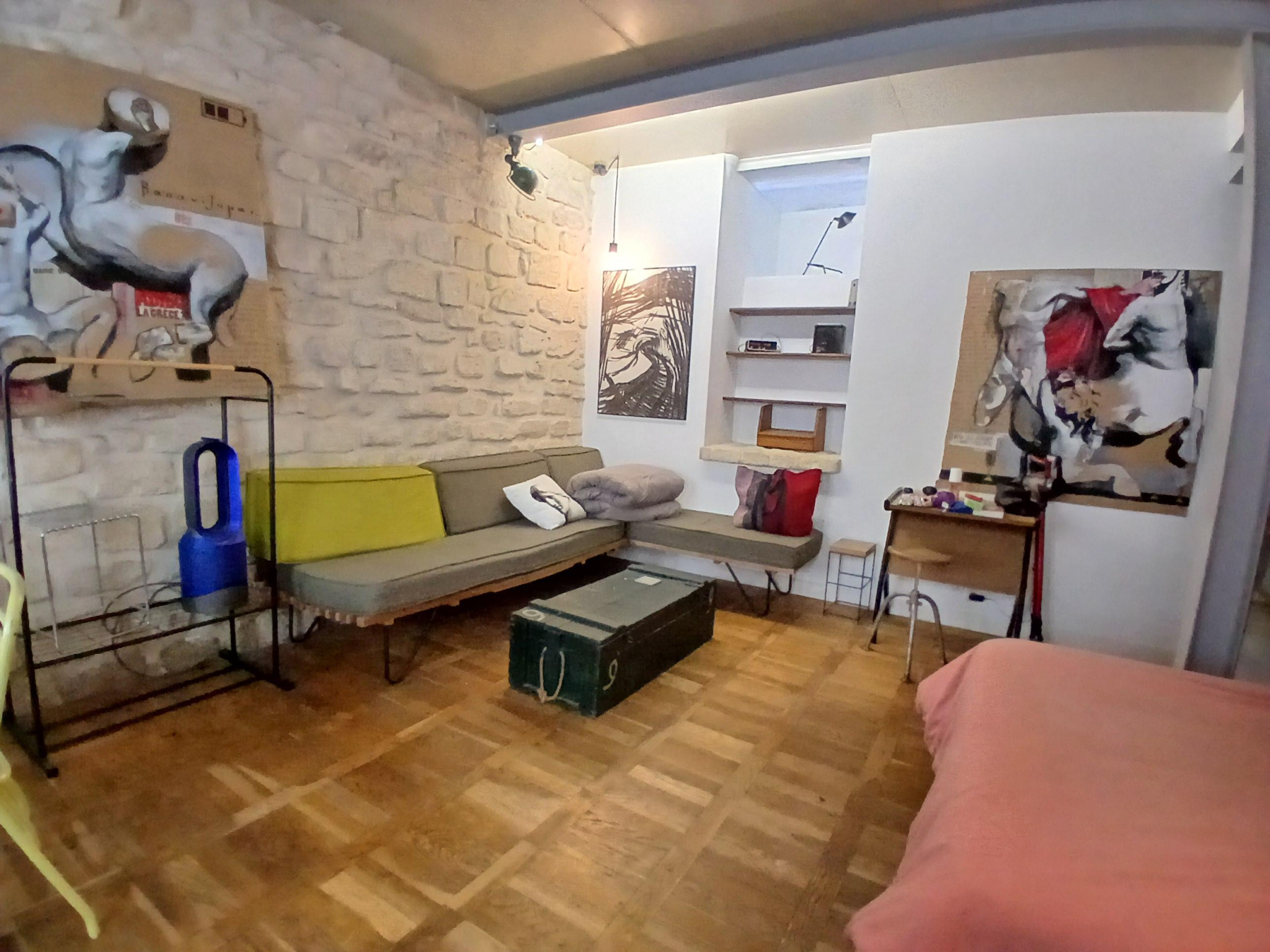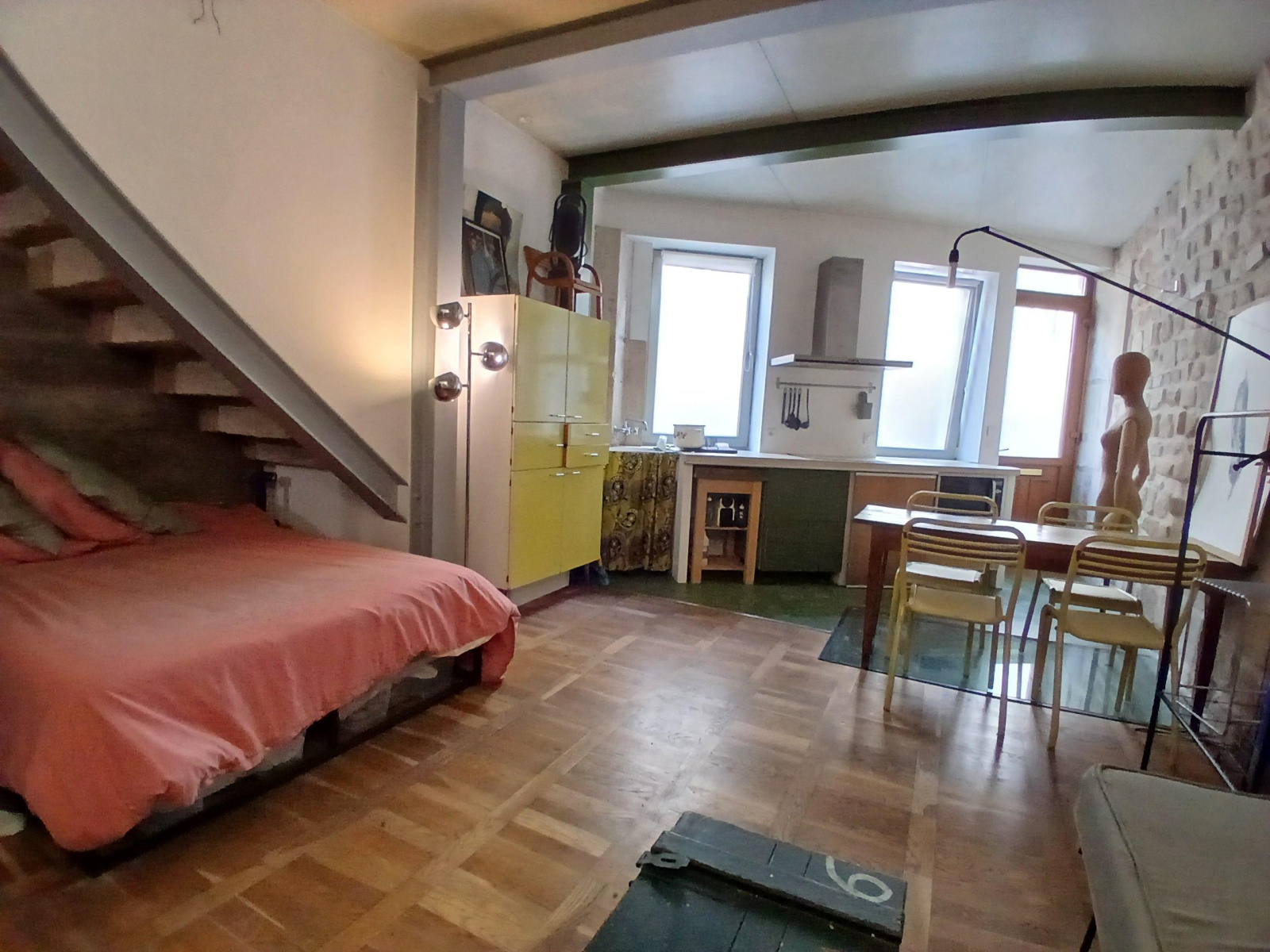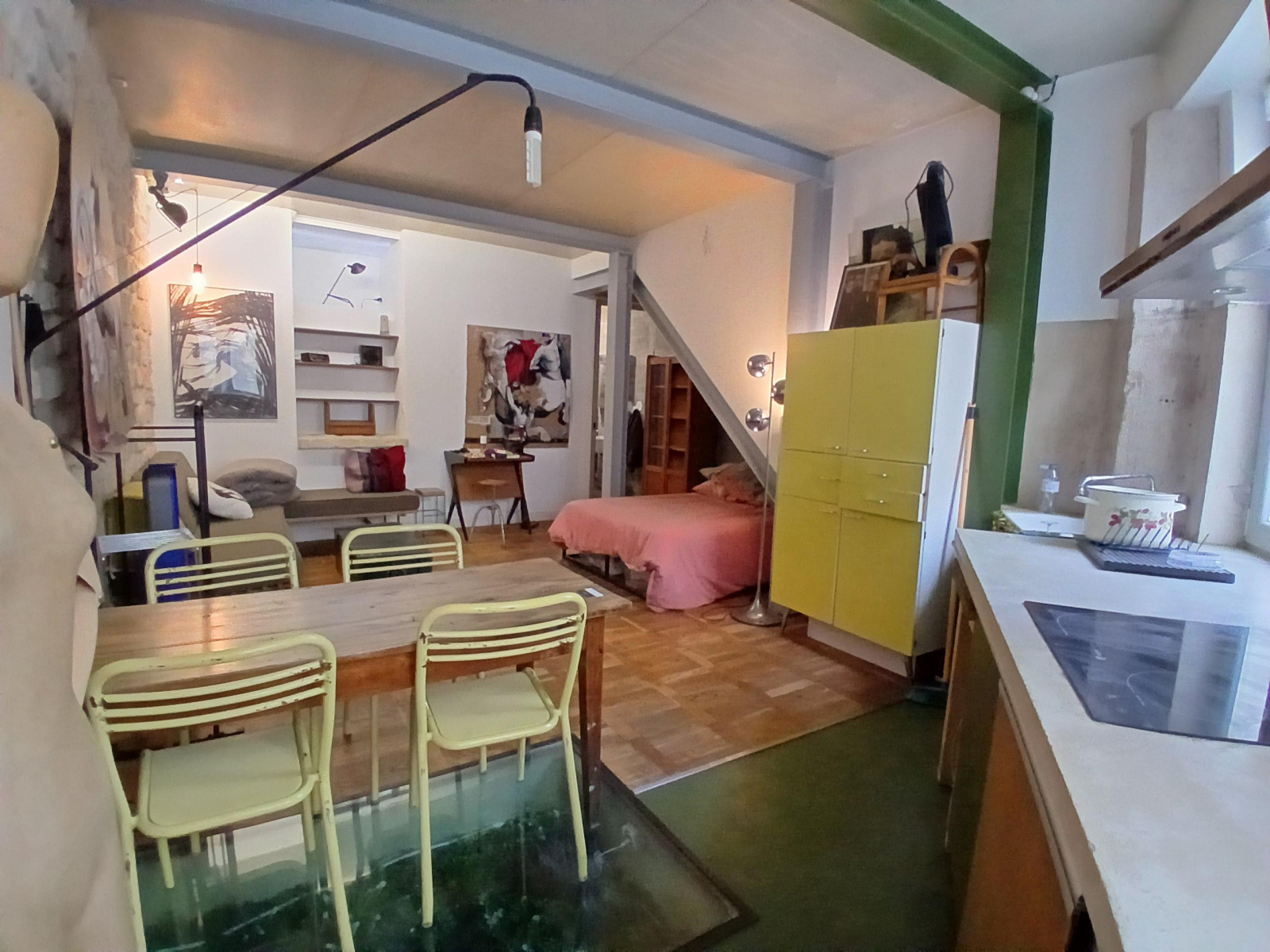 Paris (75019)VILLAGE JOURDAIN - Entre les METROS PYRENEES et JOURDAIN. A proxmité des commerces. Situé en rez-de-chaussée dans un immeuble ancien. Studio esprit loft de 31m² offrant une pièce principale avec cuisine ouverte, un coin nuit, une salle d'eau avec WC. Pierres appaentes, béton ciré et poutres métalliques reliant l'ancien et la modernité. Beaucoup de cachet et espace optimisé. A VOIR VITE !